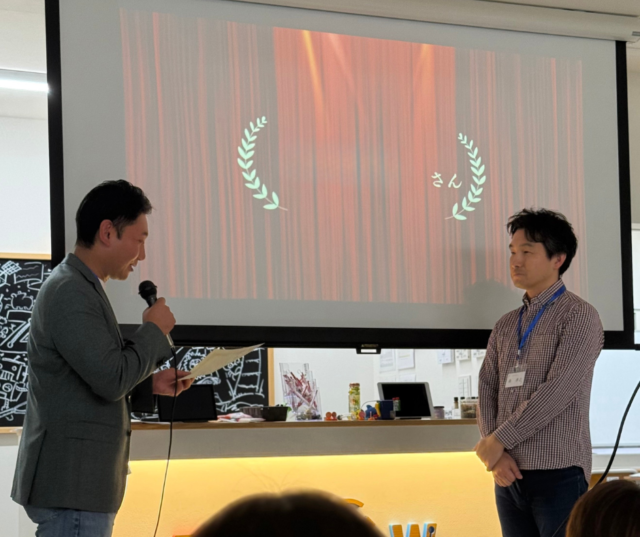 æåã«ãèªå·±ç޹ä»ãå ŒãããAIã䜿ã£ãã¢ã€ã¹ãã¬ã€ã¯ãããã¹ã¿ãŒããããã¬ãããšããããŒã«ã䜿ã£ãŠå°åŠçã奜ããããªèšèãéžãã§æ²ç€ºæ¿ã«æ²èŒãã¢ã€ã¹ãã¬ã€ã¯æ åœã®å®®èããã®èšèãå¥ã®ã¢ããªã«èœãšã蟌ã¿é³æ¥œãã€ããŠå ¬éããããšããéã³ãããŸããããå°åŠçã奜ããããªèšèãã«è¿·ãããšãªãã¡ã§ãããã審æ»å¡ã®åã©ããã¡ã«åå è å士ãç¬ãã«å ãŸããäŒå Žã¯ããã«åãããªé°å²æ°ãšãªããŸããã